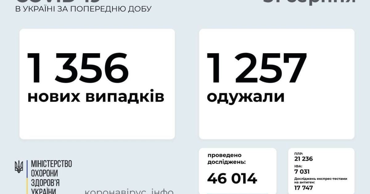 1 356 нових випадків COVID-19 зафіксовано в Україні станом на 31 серпня 2021 року. Зокрема, захворіли 75 дітей та 31 медпрацівник.