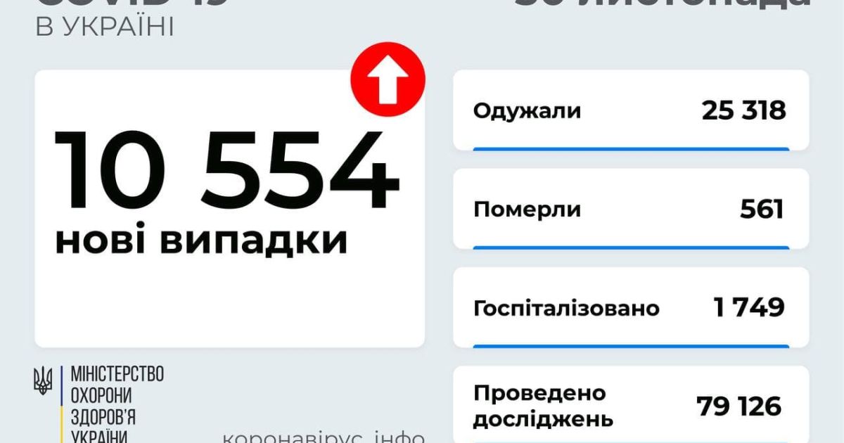 10 554 нові випадки COVID-19 зафіксовано в Україні станом на 30 листопада 2021 року. Зокрема, захворіли 846 дітей та 197 медпрацівників.