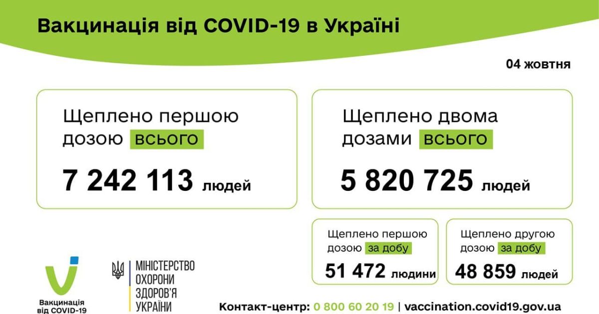 100 331 людину вакциновано проти COVID-19 за минулу добу 04 жовтня 2021 року. Одну дозу отримали 51 472 людини, повністю імунізовані - 48 859 людей