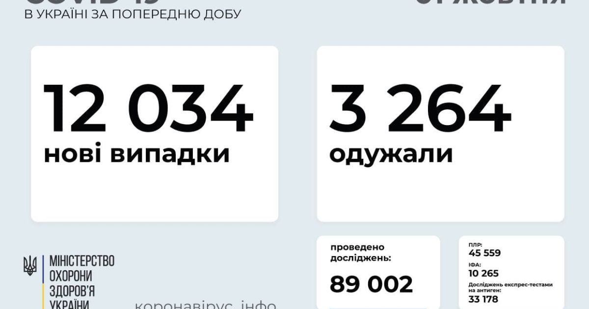 12 034 нові випадки COVID-19 зафіксовано в Україні