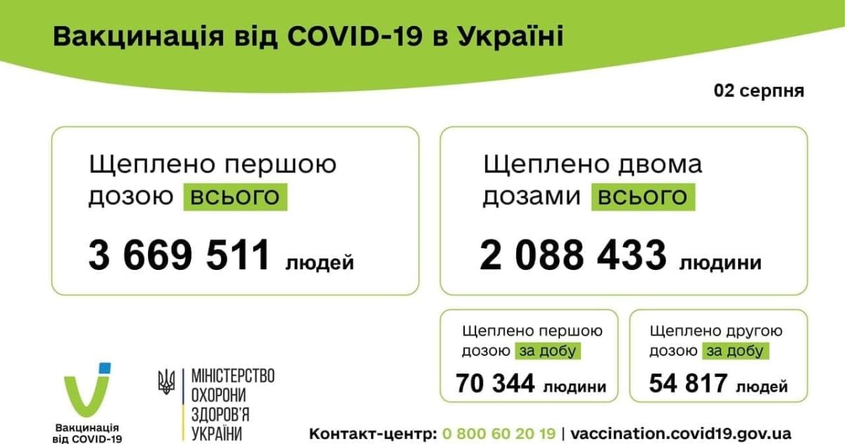 125 161 людина вакцинована проти COVID-19 за добу 02 серпня 2021 року. Одну дозу отримали 70 344 людини, повністю імунізовані - 54 817 людей