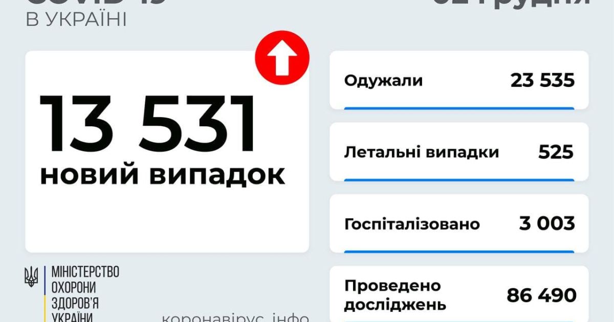 13 531 новий випадок COVID-19 зафіксовано в Україні станом на 2 грудня 2021 року. Зокрема, захворіли 1346 дітей та 240 медпрацівників.