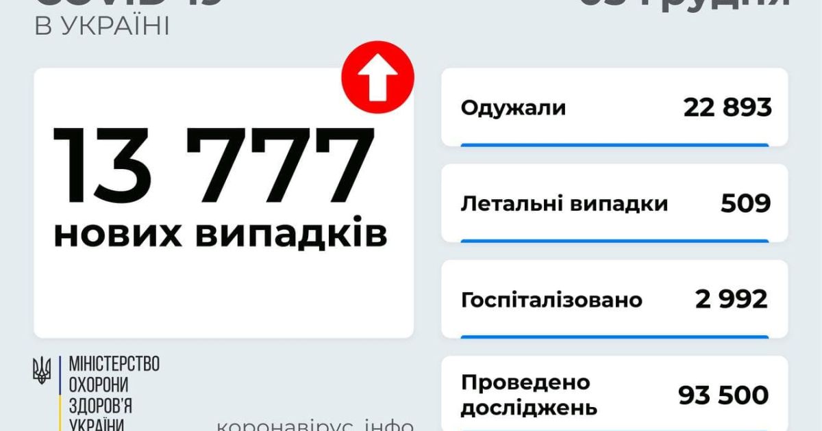 13 777 нових випадків COVID-19 зафіксовано в Україні станом на 3 грудня 2021 року. Зокрема, захворіли 1 279 дітей та 222 медпрацівники.