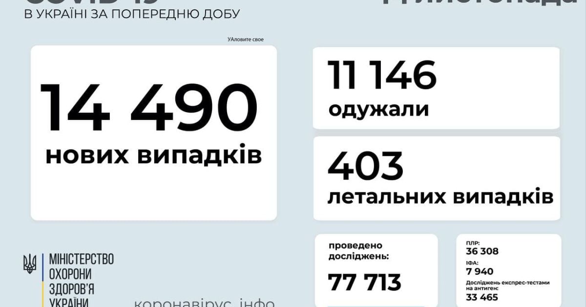 14 490 нових випадків COVID-19 зафіксовано в Україні станом на 14 листопада 2021 року. Зокрема, захворіли 1069 дітей та 135 медпрацівників.