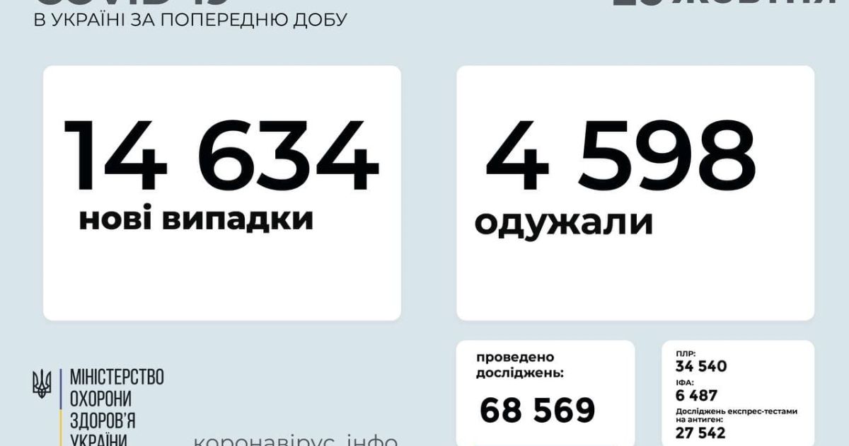 14 634 нові випадки COVID-19 зафіксовано в Україні станом на 25 жовтня 2021 року. Зокрема, захворіли 999 дітей та 173 медпрацівники.