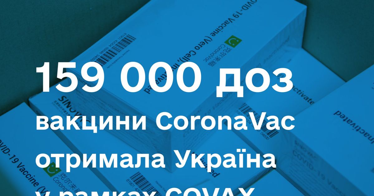 159 000 доз вакцини CoronaVac отримала Україна у рамках COVAX. Доставив вакцину Дитячий фонд ООН (ЮНІСЕФ)