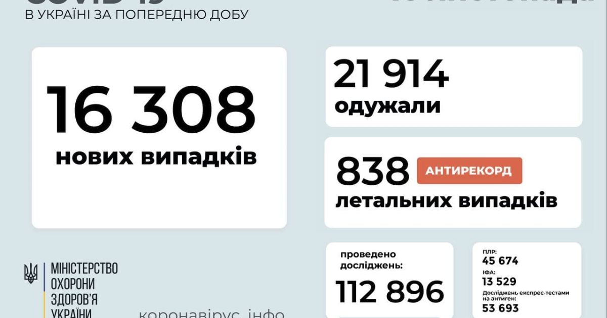 16 308 нових випадків COVID-19 зафіксовано в Україні станом на 16 листопада 2021 року. Зокрема, захворіли 1168 дітей та 327 медпрацівників.