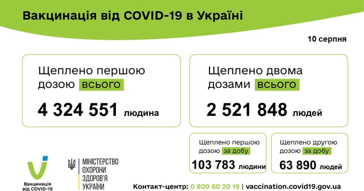 167 673 людини вакциновано проти COVID-19 за добу 10 серпня 2021 року. Одну дозу отримали 103 783 людини, повністю імунізовані - 63 890 людей