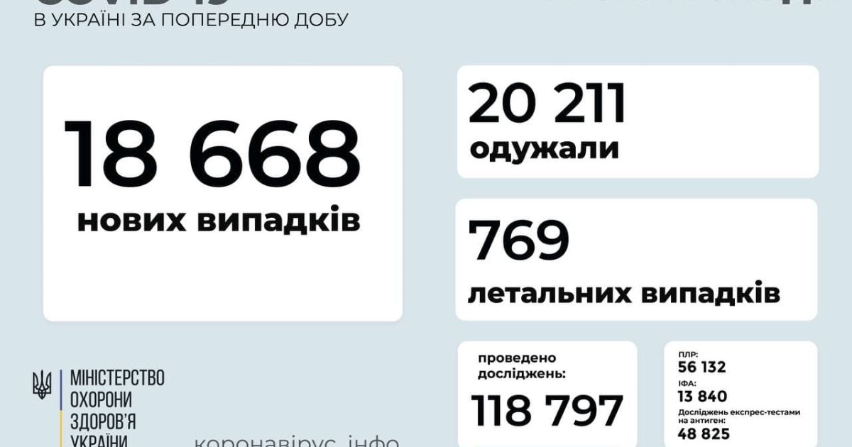 18 668 нових випадків COVID-19 зафіксовано в Україні станом на 17 листопада 2021 року. Зокрема, захворіли 1312 дітей та 403 медпрацівники.