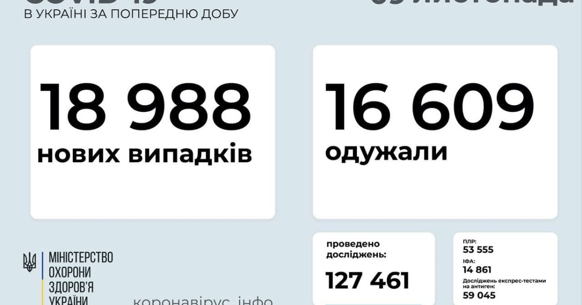 18 988 нових випадків COVID-19 зафіксовано в Україні станом на 9 листопада 2021 року. Зокрема, захворіли 1183 дитини та 426 медпрацівників.