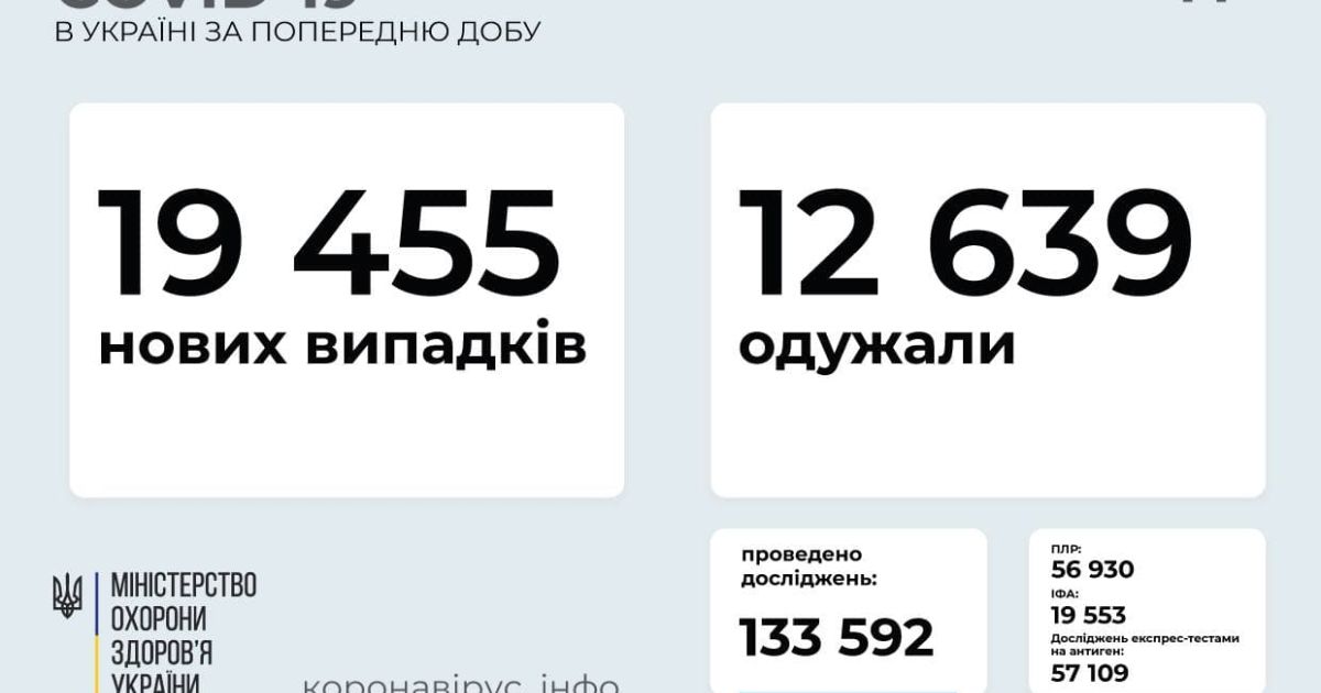 19 455 нових випадків COVID-19 зафіксовано в Україні