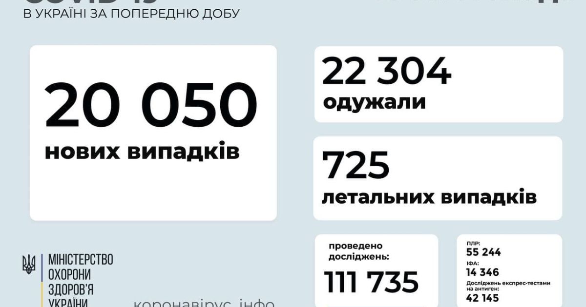 20 050 нових випадків COVID-19 зафіксовано в Україні