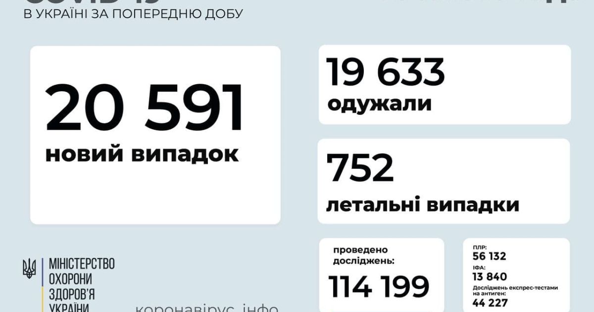 20 591 новий випадок COVID-19 зафіксовано в Україні
