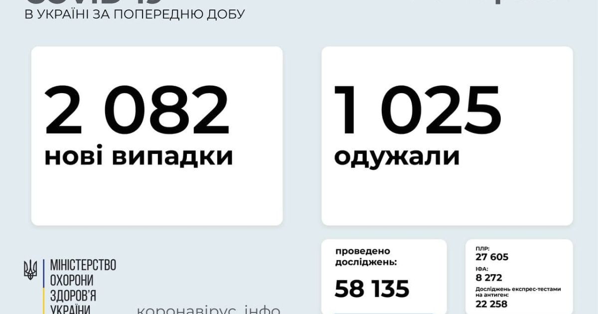 2082 нові випадки COVID-19 зафіксовано в Україні