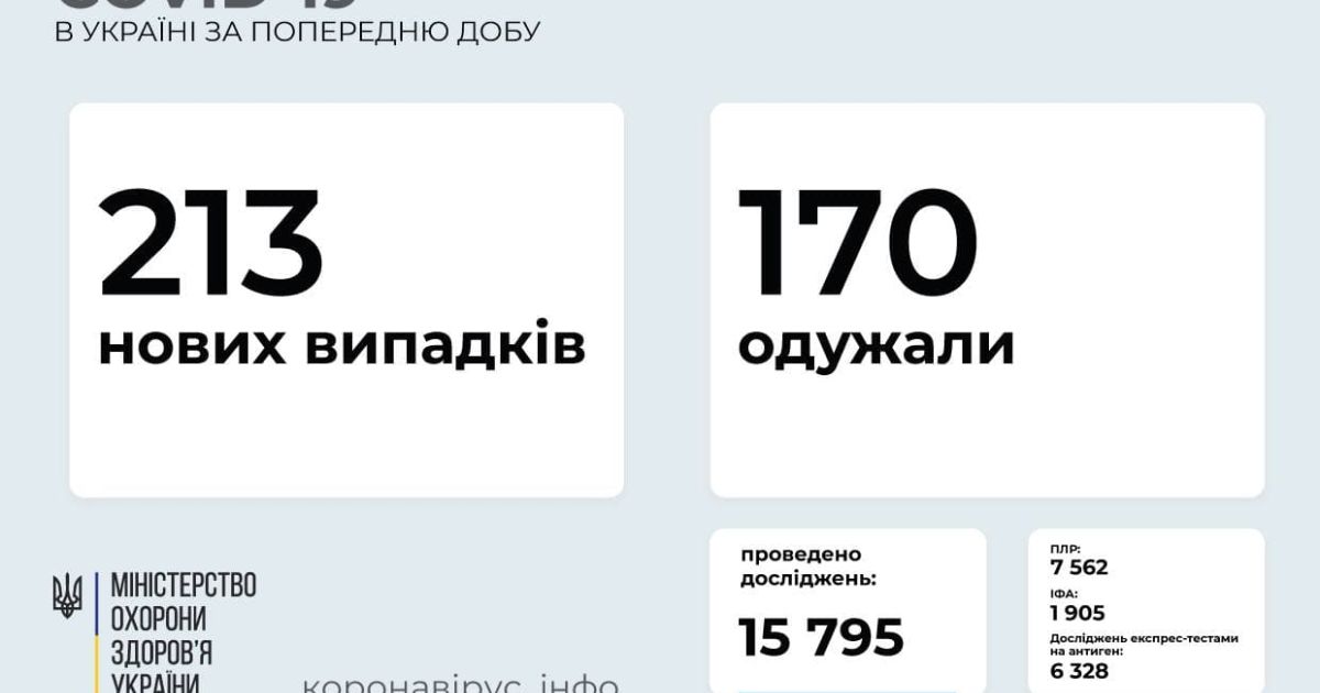 213 нових випадків COVID-19 зафіксовано в Україні
