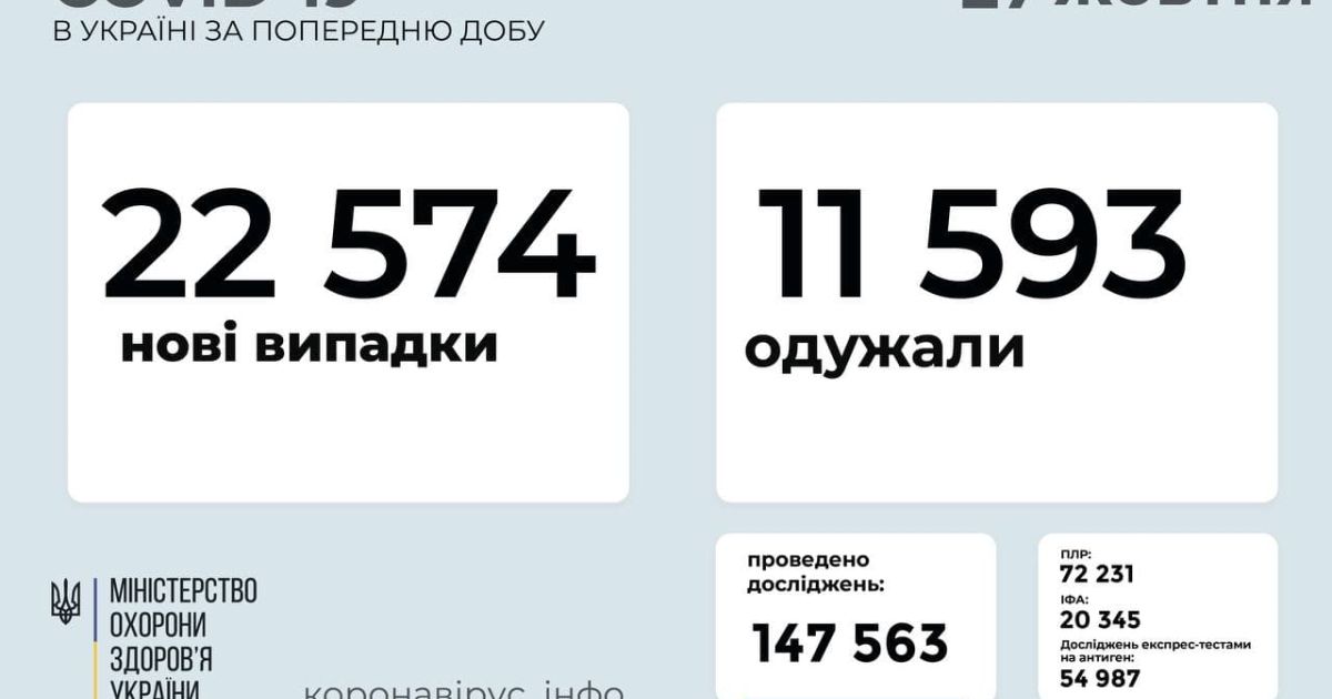 22 574 нові випадки COVID-19 зафіксовано в Україні станом на 27 жовтня 2021 року. Зокрема, захворіли 1532 дитини та 399 медпрацівників.