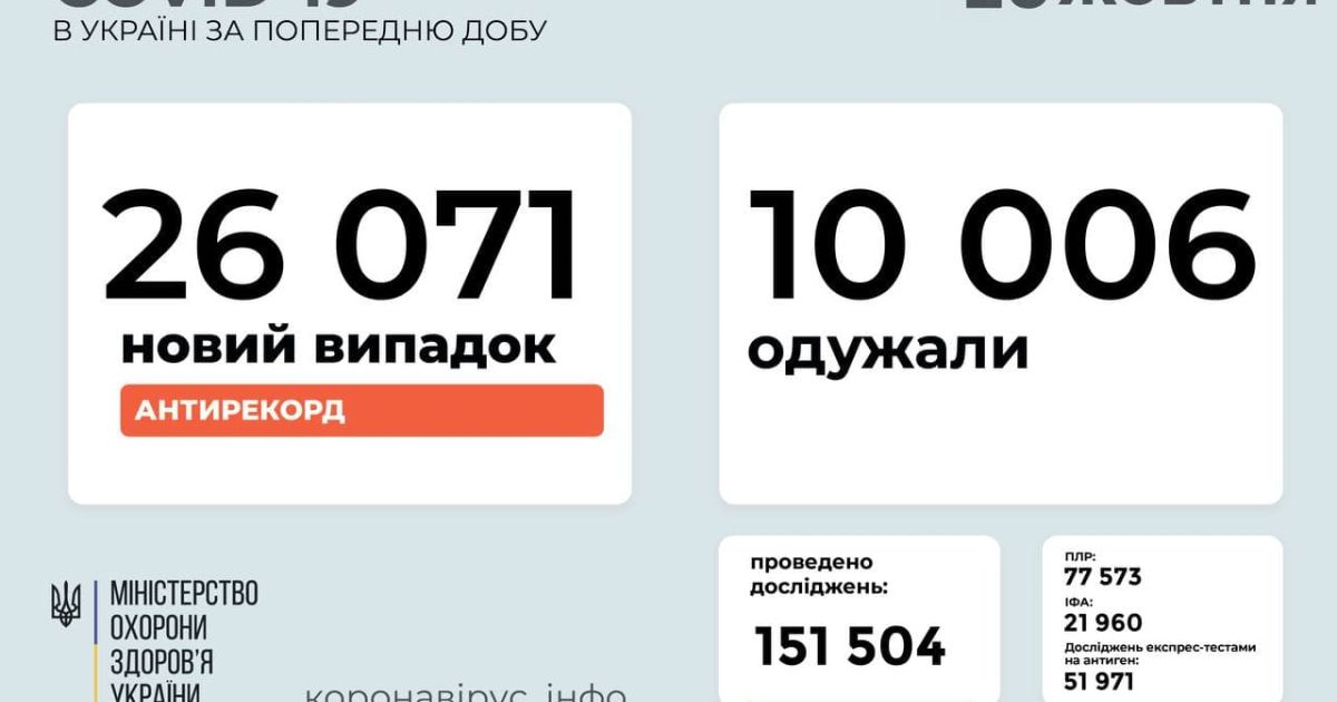 26 071 новий випадок COVID-19 зафіксовано в Україні станом на 28 жовтня 2021 року. Зокрема, захворіли 1830 дітей та 477 медпрацівників.