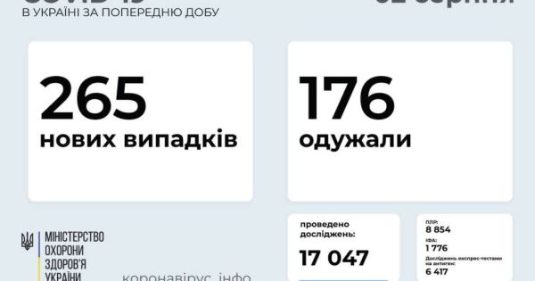 265 нових випадків COVID-19 зафіксовано в Україні станом на 2 серпня 2021 року. Зокрема, захворіли 11 дітей та 1 медпрацівник.