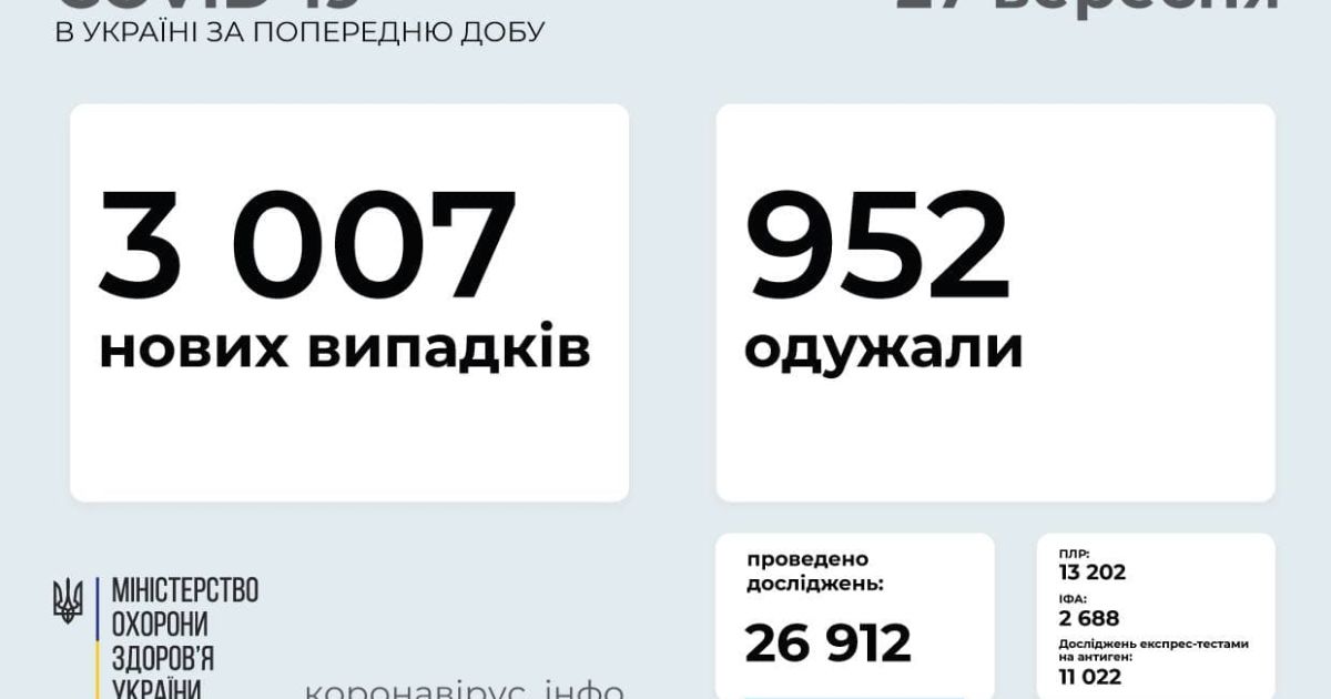 3 007 нових випадків COVID-19 зафіксовано в Україні станом на 27 вересня 2021 року. Зокрема, захворіли 286 дітей та 32 медпрацівники.