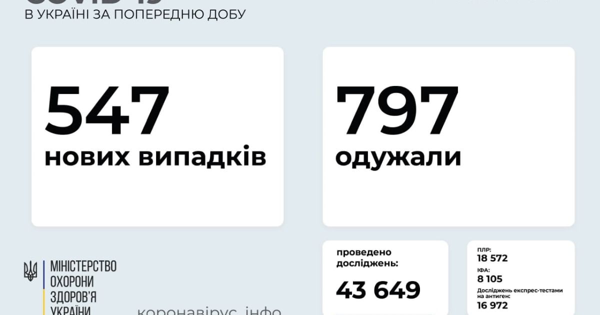 547 нових випадків COVID-19 зафіксовано в Україні станом на 14 липня 2021 року. Зокрема, захворіли 34 дитини та 23 медпрацівники.