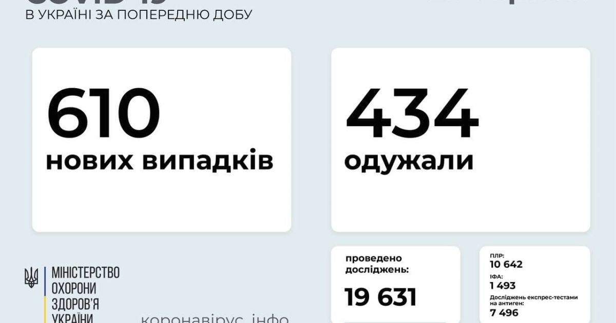 610 нових випадків COVID-19 зафіксовано в Україні станом на 23 серпня 2021 року. Зокрема, захворіли 33 дитини та 3 медпрацівники.