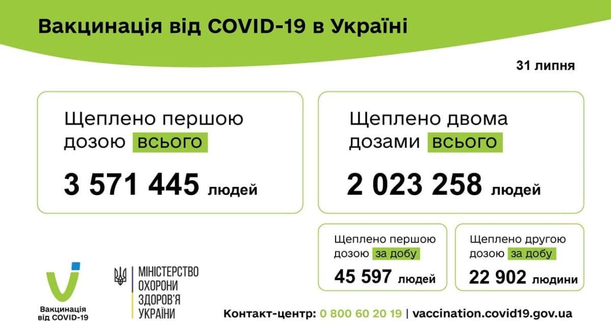 68 499 людей вакциновано проти COVID-19 за добу 31 липня 2021 року. Одну дозу отримали 45 597 людей, повністю імунізовані - 22 902 людини