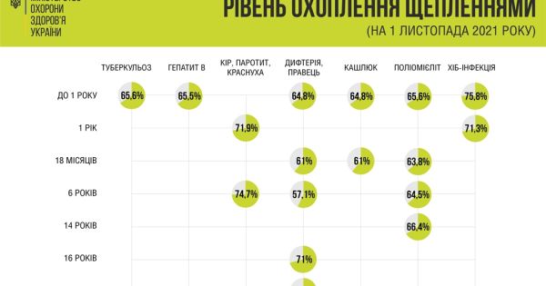 Перше щеплення у віці 1 року станом на 1 листопада отримали 71,9% дітей, а друге (у віці 6 років) — 74,7%.