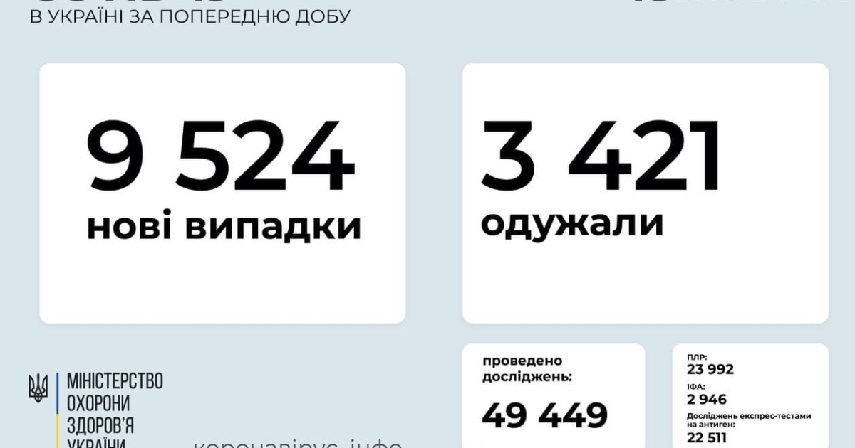 9 524 нові випадки COVID-19 зафіксовано в Україні