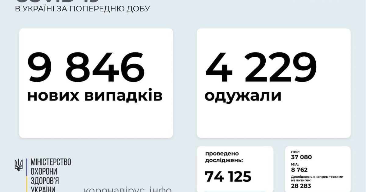 9 846 нових випадків COVID-19 зафіксовано в Україні
