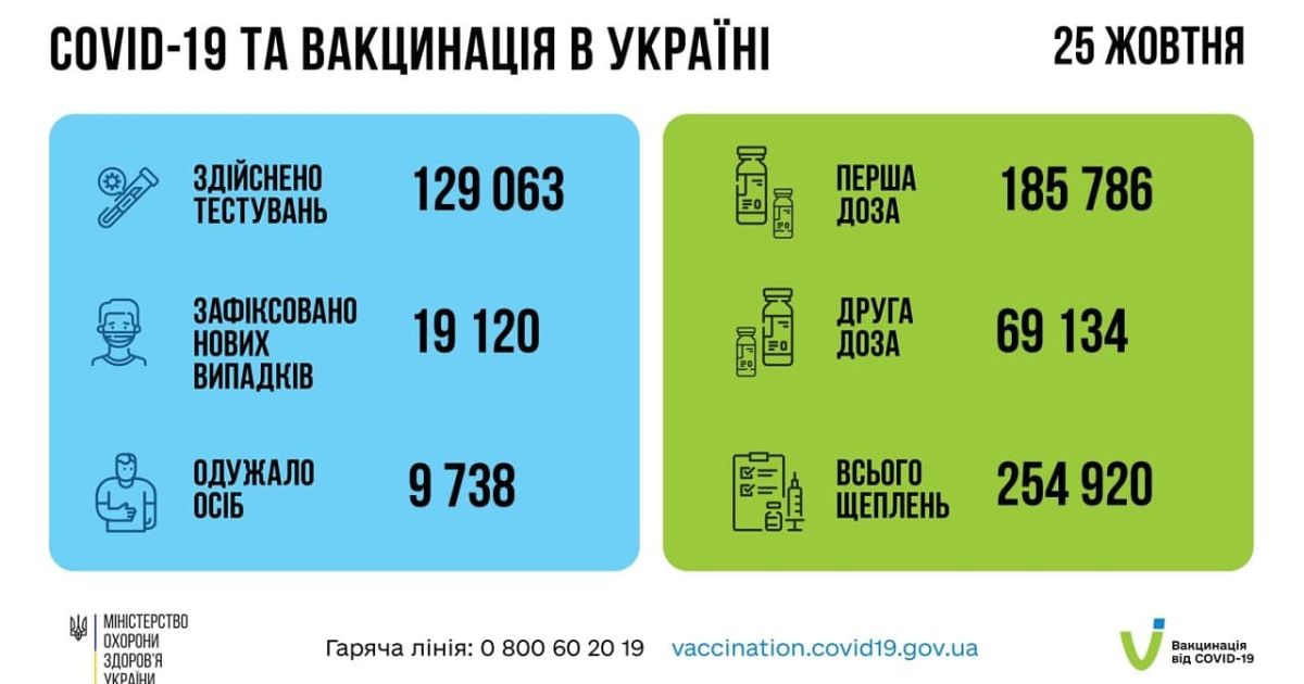 ◾️ зафіксовано 19 120 нових підтверджених випадків коронавірусної хвороби COVID-19 (з них дітей – 1414, медпрацівників – 338);