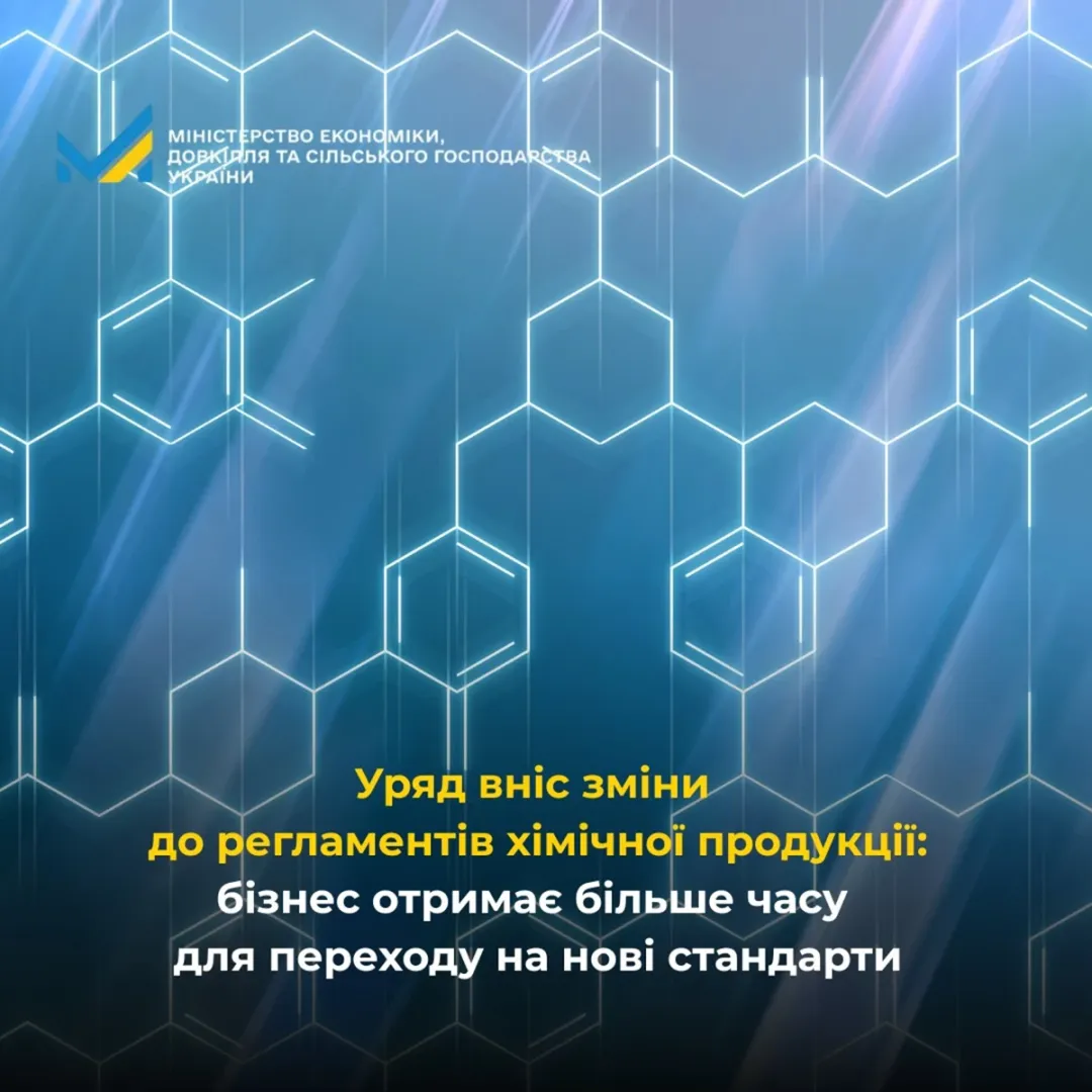 Цифровий фон із візерунком з’єднаних шестикутників, що нагадують хімічні структури, на синьому градієнті з світлими променями. У верхньому лівому куті — логотип і напис українською: «Міністерство економіки, довкілля та сільського господарства України». У центрі — повідомлення про зміни в регламенті хімічної продукції: бізнесу надано більше часу для переходу на нові стандарти.