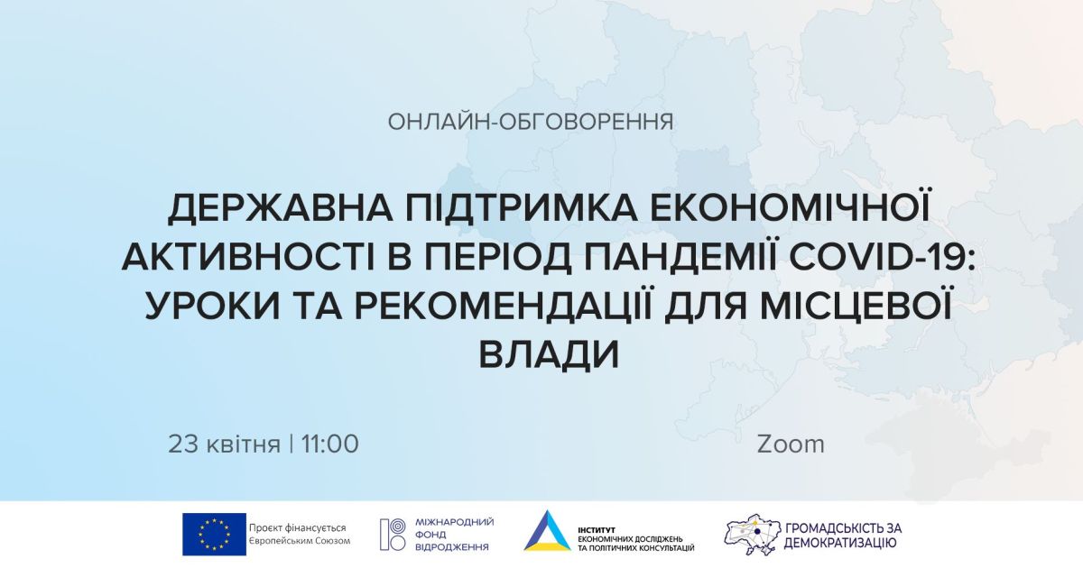 23 квітня 2021 року (11:00 – 12:30) інститут економічних досліджень та політичних консультацій проводить онлайн-обговорення «Державна підтримка економічної активності в період пандемії COVID-19: уроки та рекомендації для місцевої влади».