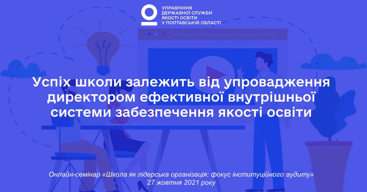 «Інституційний аудит – це «свіжий погляд зі сторони» для побудови перспективного шляху розвитку школи. Критерії, за якими проводиться інституційний аудит, аналогічні критеріям внутрішньої системи забезпечення якості освіти. Тобто директор, опікуючись удосконаленням якості освіти в школі, має залучити до цього процесу вчителів, учнів, батьків, засновника», — наголосив Юрій Кращенко, начальник управління Державної служби якості освіти у Полтавській області, під час онлайн-cемінару «Школа як лідерська організація: фокус інституційного аудиту» 27 жовтня 2021 року.