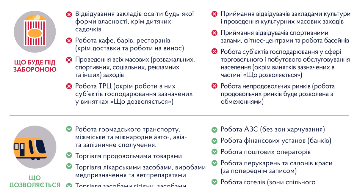 Також уряд заборонить роботу магазинів непродовольчих товарів, кінотеатрів, фітнес-клубів, спортзалів, театрів, а також ТРЦ, окрім купівлі товарів першої необхідності.