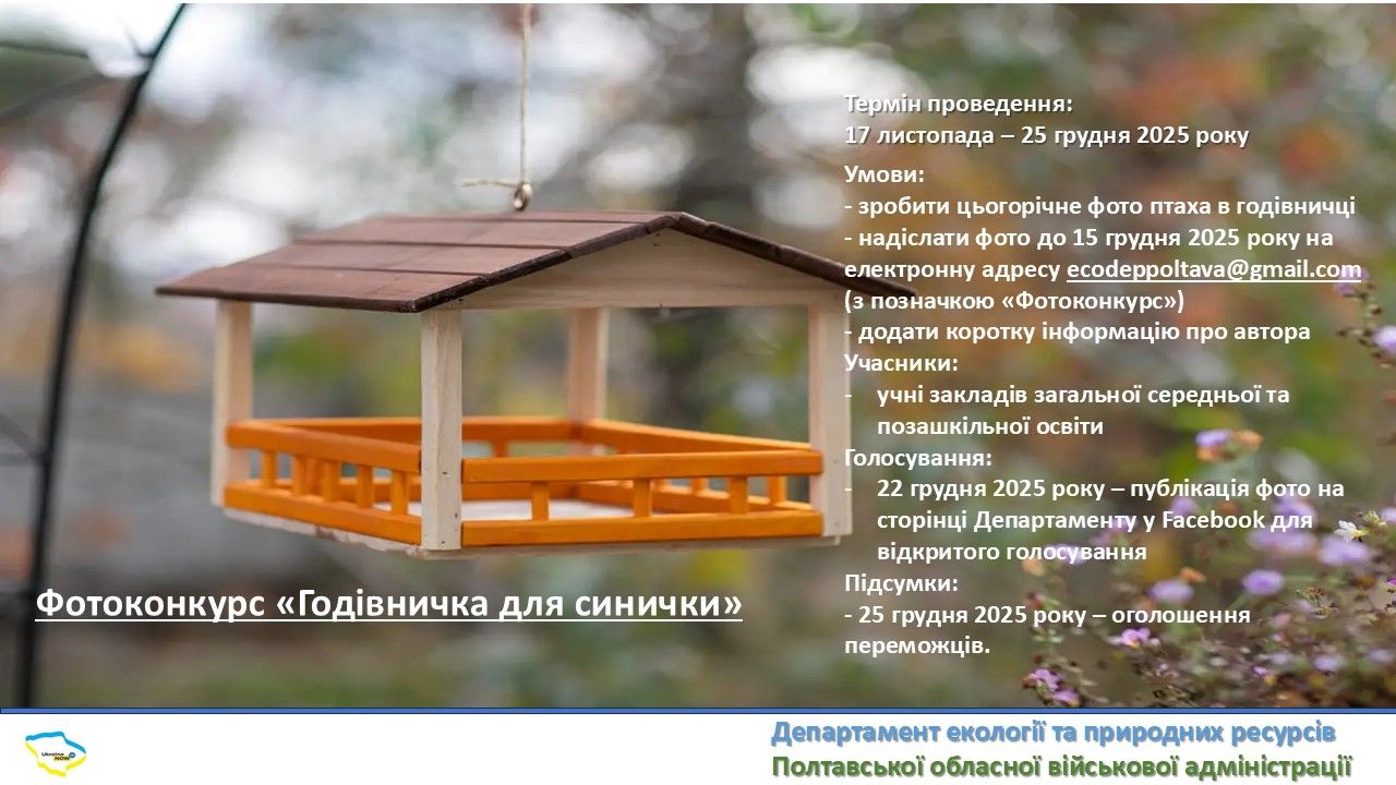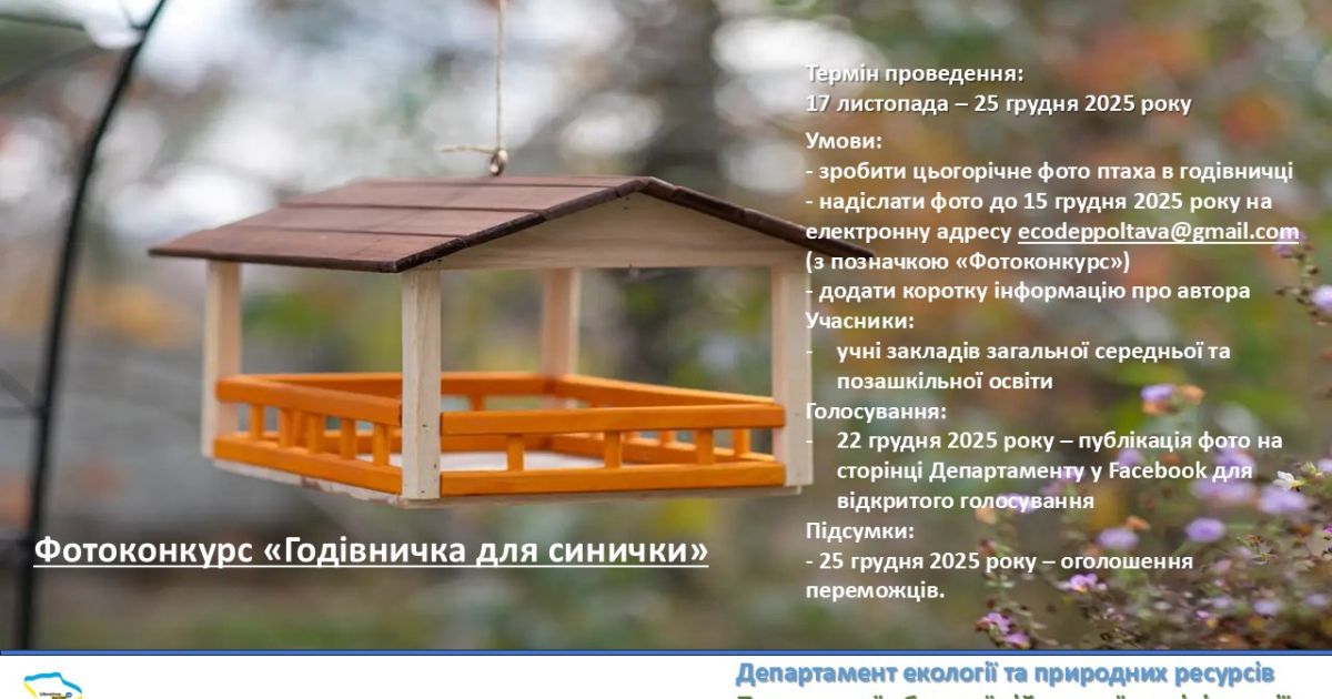 Департамент екології та природних ресурсів Полтавської обласної військової адміністрації проводить з 17 листопада до 25 грудня 2025 року конкурс дитячих фотографій «Годівничка для синички».