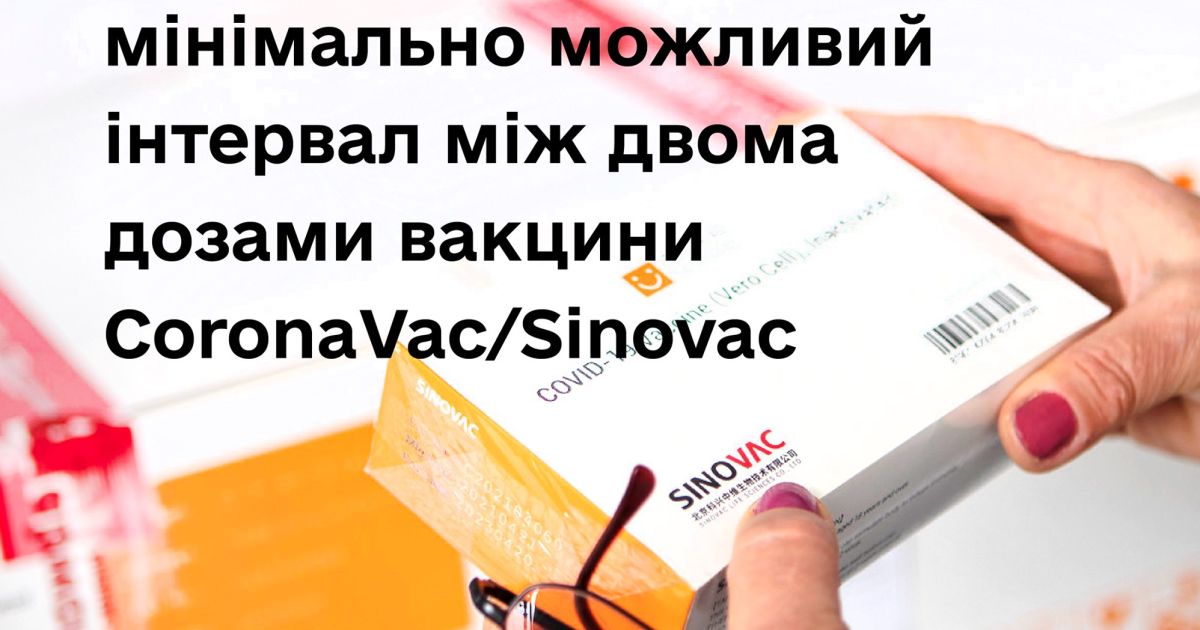 У зв’язку зі стрімким поширенням штаму коронавірусу SARS-CoV-2 «Дельта», поступовим зростанням захворюваності в Україні та необхідністю якнайшвидше забезпечити захистом якомога більше українців, Міністерство охорони здоров’я рекомендує скоротити інтервал між першою та другою дозою вакцини CoronaVac від Sinovac Biotech до мінімального терміну, зазначеного в офіційній інструкції, – 14 днів.