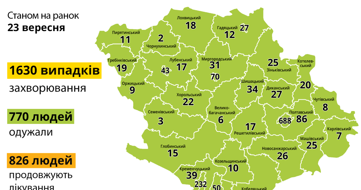 За інформацією Полтавського обласного лабораторного центру МОЗ України, від початку карантину на Полтавщині діагностували 1630 випадків захворювання на COVID-19.