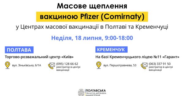 В Області п’ять Центрів вакцинації – Полтава, Кременчук, Лубни, Миргород, Горішні Плавні – працюватимуть традиційно з 9:00 18.00, з четверга до неділі включно. У ці дні щеплюватимуть вакциною Coronavac. Виключення Полтава та Кременчук, де у неділю, 18 липня, масово вакцинуватимуть тільки вакциною Pfizer.