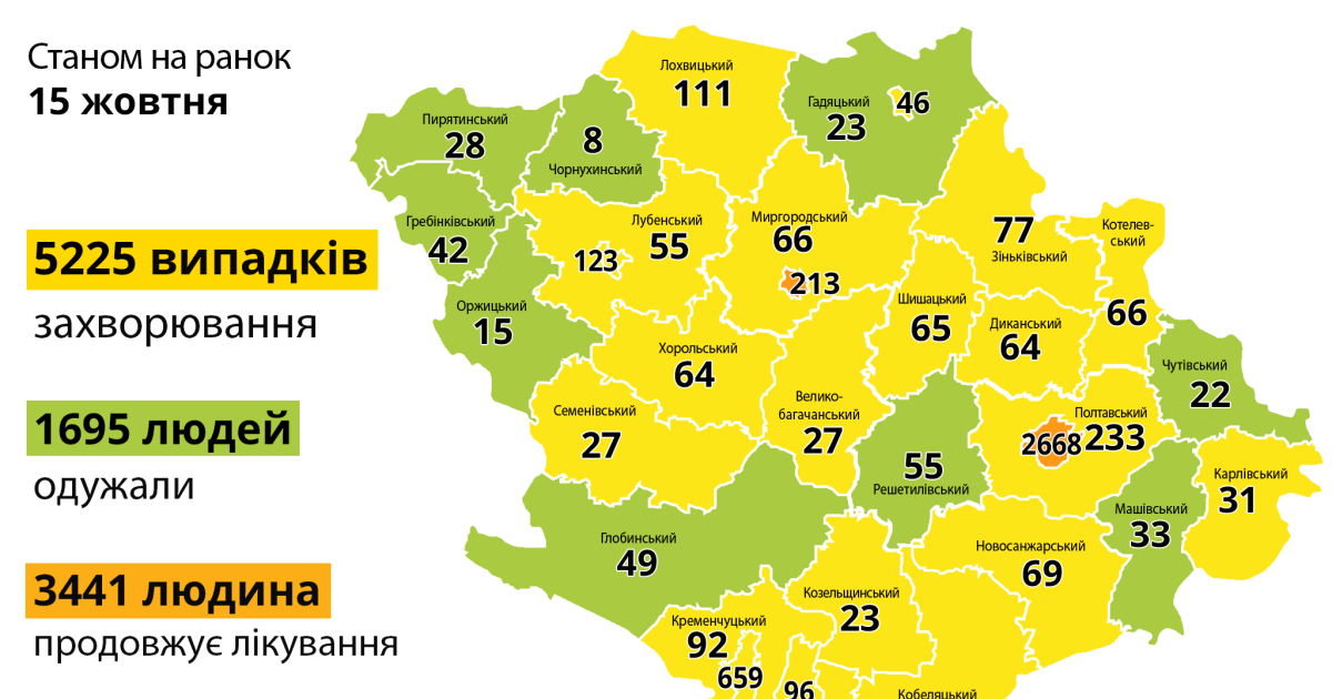 За інформацією Полтавського обласного лабораторного центру МОЗ України, від початку карантину на Полтавщині діагностували 5225 випадків захворювання на COVID-19.