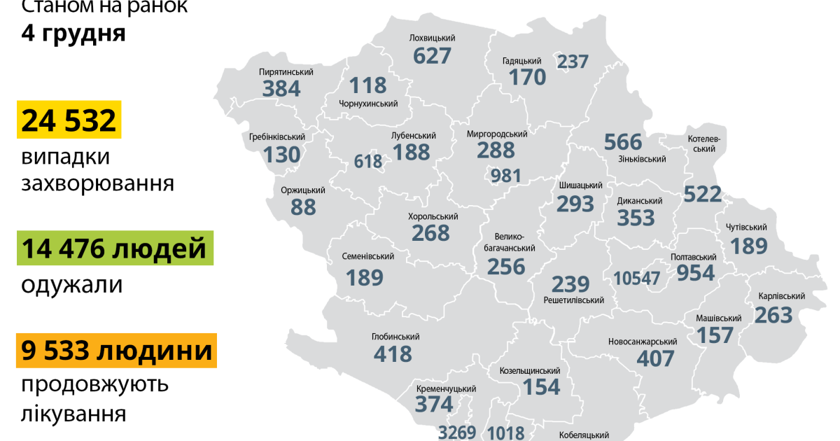За інформацією Полтавського обласного лабораторного центру МОЗ України, від початку карантину на Полтавщині діагностували 24 532 випадки захворювання на COVID-19.