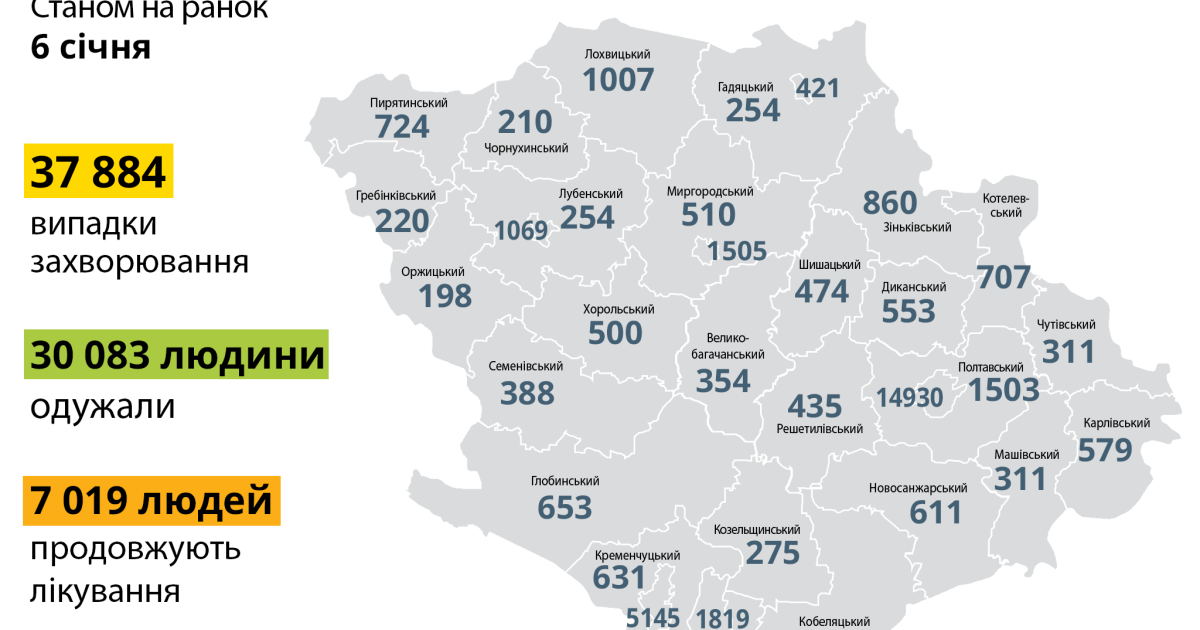 За інформацією Полтавського обласного лабораторного центру МОЗ України, від початку карантину на Полтавщині діагностували 37 884 випадки захворювання на COVID-19.