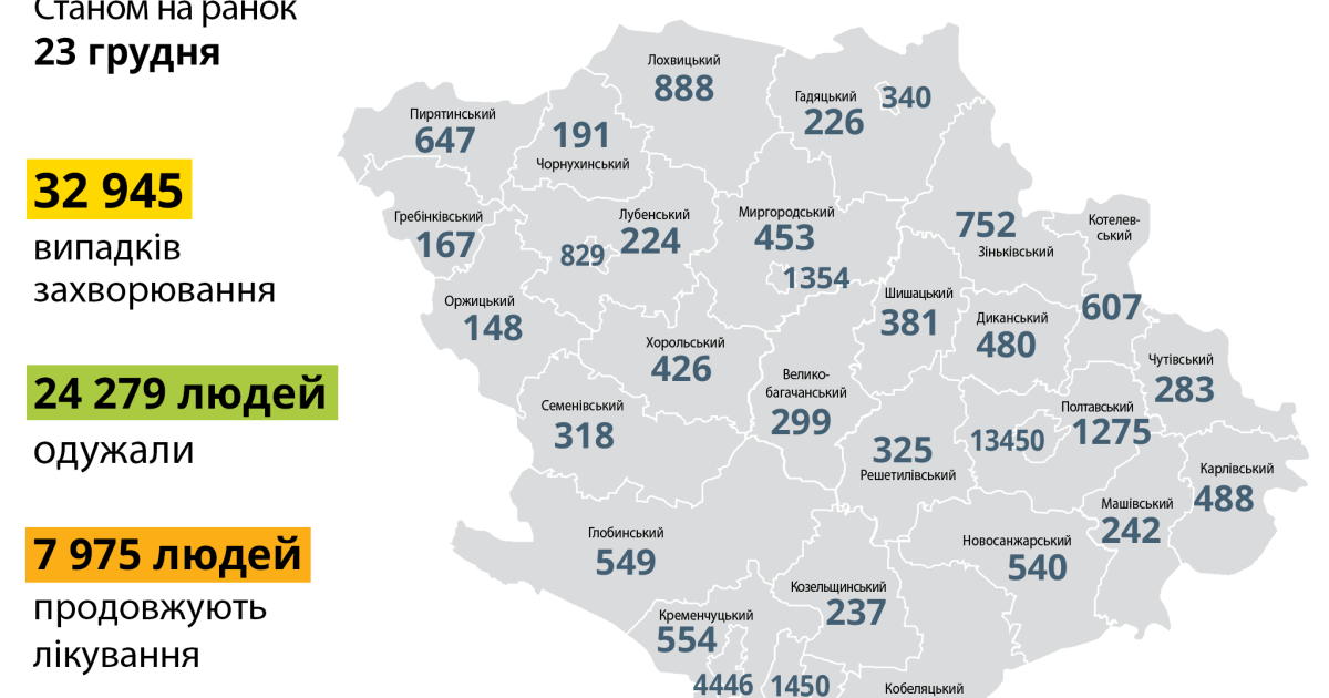 За інформацією Полтавського обласного лабораторного центру МОЗ України, від початку карантину на Полтавщині діагностували 32 945 випадків захворювання на COVID-19.