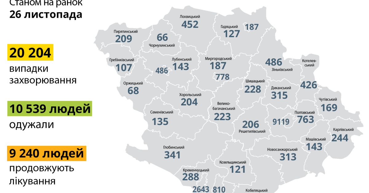 За інформацією Полтавського обласного лабораторного центру МОЗ України, від початку карантину на Полтавщині діагностували 20 204 випадки захворювання на COVID-19.