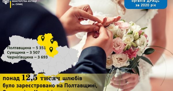 Зокрема, на Полтавщині протягом 2020 року до установ державної реєстрації актів цивільного стану звернулося 5,3 тисячі закоханих пар. У Сумській області утворилося 3,5 тисячі нових родин, а на Чернігівщині весільний марш пролунав для 3,6 тисячі пар.
