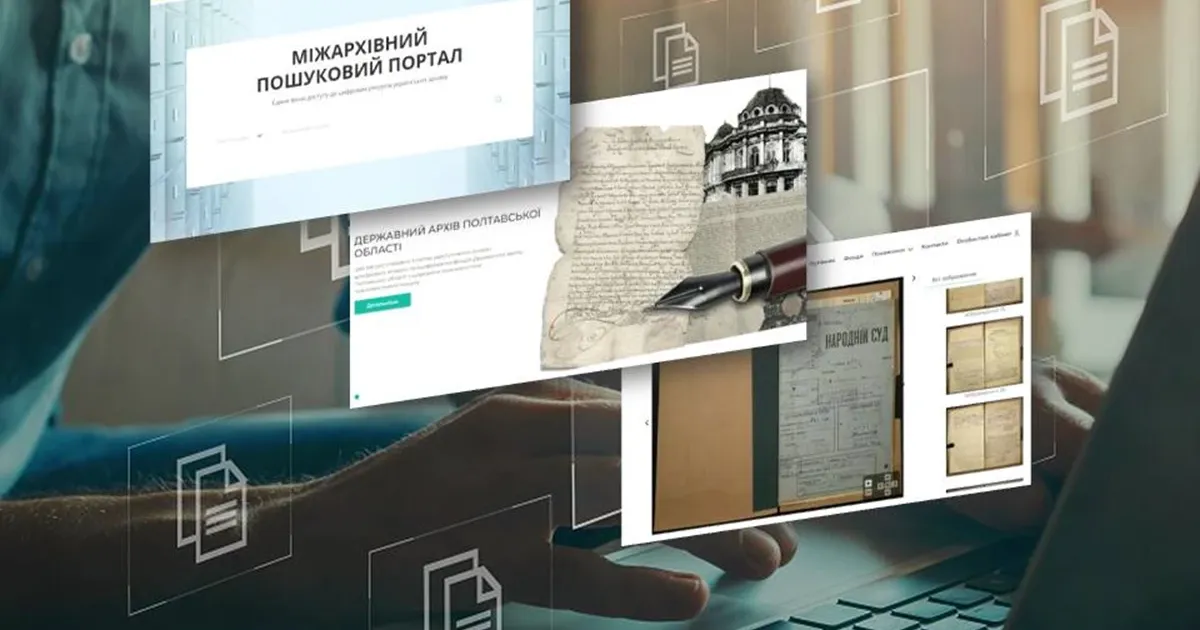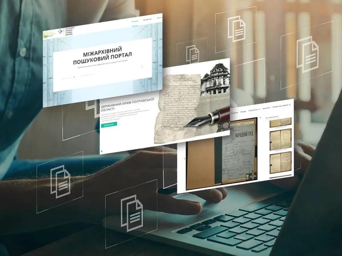 Людина працює за ноутбуком, над клавіатурою візуалізовано кілька цифрових вікон — інтерфейси архівних порталів і пошукових систем. На фоні — іконки документів, що символізують цифрове управління архівами. Українські написи вказують на міжархівний пошуковий портал, Державний архів Полтавської області та Народний суд. Зображення ілюструє доступність історичних документів через онлайн-платформи.