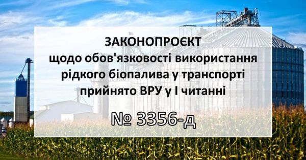 На засіданні Парламенту схвалено у першому читанні за основу законопроєкт № 3356-д від 05.11.2020 щодо обов'язковості використання рідкого біопалива (біокомпонентів) у галузі транспорту: http://w1.c1.rada.gov.ua/pls/zweb2/webproc4_2?id=&pf3516=3356-%D0%B4&skl=10.