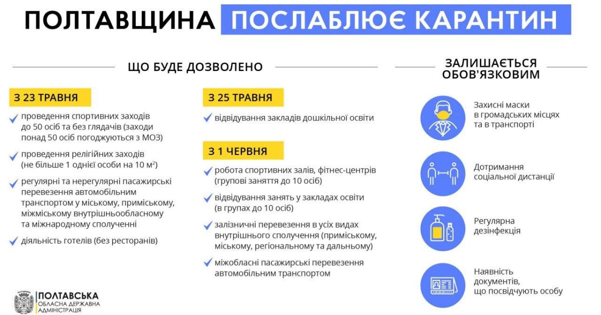 Міністерство охорони здоров’я дозволило Полтавській області запроваджувати 2-ий етап послаблення карантину. Згідно з оприлюдненими 23 травня даними, епідеміологічна ситуація в області відповідає всім трьом вимогам (інцидентність – 0,22, завантаженість ліжок – 0,93 та охоплення тестуванням – 12,41).