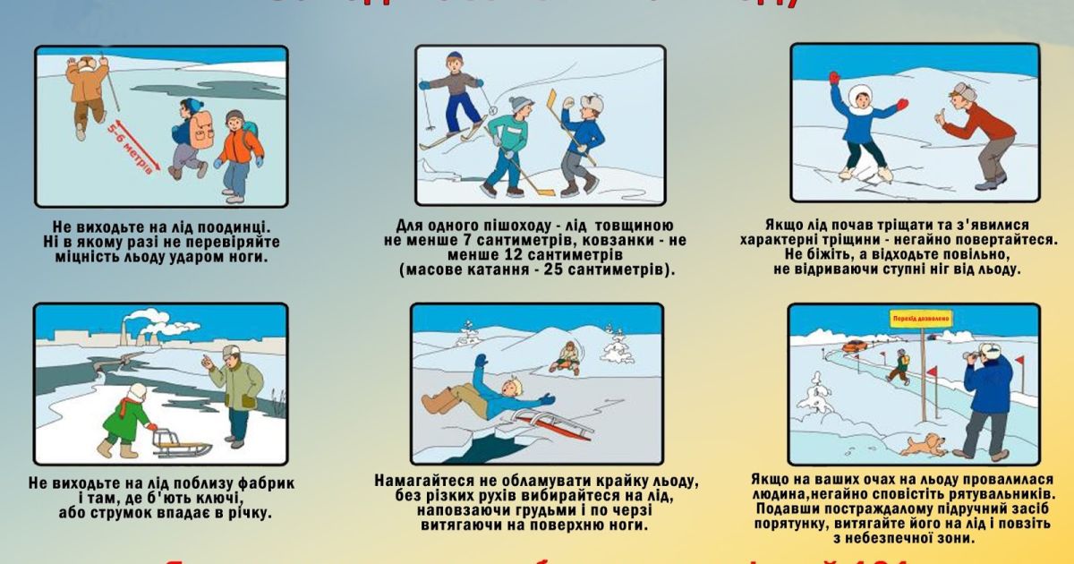 Перебуваючи зимової пори на замерзлих водоймах: чи то рибалячи, чи то активно відпочиваючи, – потрібно пам’ятати правила поводження на льоду. Найбільш небезпечна крига – перша та остання: вона ще (або вже) не міцна.