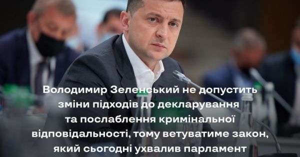 Президент Володимир Зеленський ветуватиме Закон «Про внесення змін до Кодексу України про адміністративні правопорушення, Кримінального кодексу України щодо вдосконалення відповідальності за декларування недостовірної інформації та неподання суб'єктом декларування декларації особи, уповноваженої на виконання функцій держави або місцевого самоврядування» (законопроект № 4651), який ухвалила Верховна Рада.