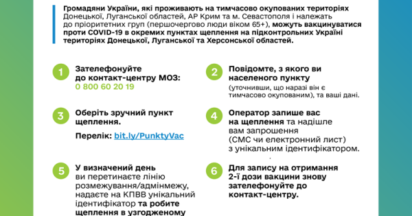 Громадяни України, які проживають на тимчасово окупованих територіях Донецької, Луганської областей, АР Крим та м. Севастополя, можуть записатися на вакцинацію проти COVID-19.